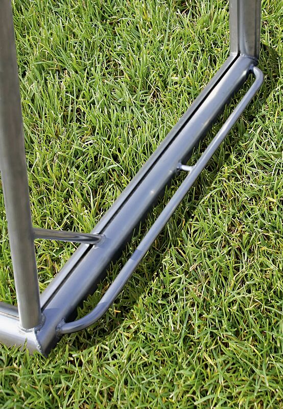 Fußballtor mit einem vollverschweißten Aluminium-Grundrahmen und Transportgriffen. Torrahmen aus Ovalprofil 120 x 100 mm mit vielfacher Innenprofilierung und Nut, Bodenrahmen mit robustem Rechteckprofil 75 x 50 mm mit Nut sowie große Netzbügel aus sehr stabilem Rundrohr (Ø 50 mm). Torrahmen und Bodenrahmen mit Nut in denen die Netzhalter eingedreht werden können, so dass das Netzoptimal befestigt ist. GS-geprüft in Verbindung mit Bodenverankerung. Nach FIFA-DFB-Vorschrift und DIN-EN 748. Obere Netztiefe 800 mm. Die Lieferung erfolgt mit zwei unterschiedlichen Netzbefestigungssystemen. Netz ist nicht im Lieferumfang enthalten.
