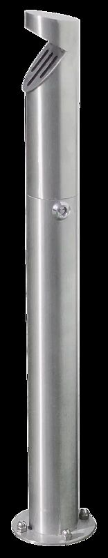 Ascher aus Edelstahl V2A, mit kerbenförmiger Einwurföffnung und schwenkbarer Schlitzklappe. Mit Fußplatte (Drm. 150 mm, 4 Befestigungslöcher Drm. 8,5 mm), Bodenbefestigungsmaterial nicht im Lieferumfang enthalten. Ascher mittels Dreikantschloss entriegeln, Oberteil abnehmen und über die Einwurföffnung entleeren (Schlitzklappe klappbar), 1 Dreikantschlüssel im Lieferumfang enthalten.