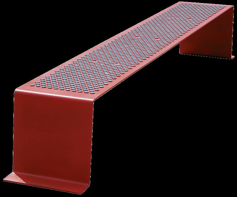 Sitz mit Seitenteilen und gelochter Sitzfläche (Ø 20 mm) aus Flachstahl, 8 mm. Mit Kunststoffnoppen. Unsichtbare Bodenbefestigung mittels Gewindestangen zum Einbetonieren (nicht im Lieferumfang enthalten).