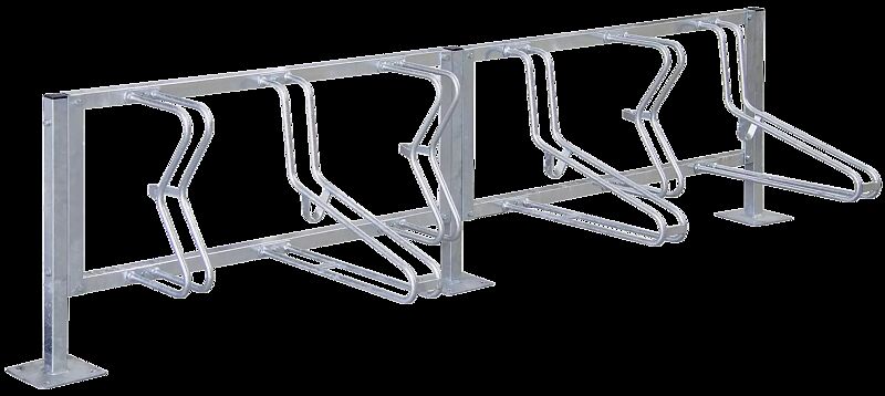 Stahl-Grundrahmen bestehend aus zwei 3er-Einheiten aus Quadratrohr (35 x 35 mm). Haltebügel aus Rundrohr (Ø 15 mm). Tiefstellung für Räder bis Reifenbreite 43 mm, Hochstellung für Mountainbikes bis Reifenbreite 53 mm. Lieferung inkl. Montagematerial zur Verschraubung der Haltebügel auf dem Grundrahmen.