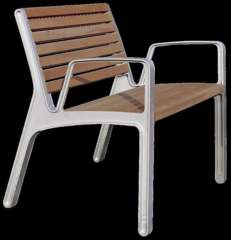 Sitz mit Seitenteilen und Armlehnen aus Aluguss, natur. Sitzfläche und Rückenlehne mit schmaler Holzbelattung. Unsichtbare Bodenbefestigung mittels Gewindestangen zum Einbetonieren (nicht im Lieferumfang enthalten).
