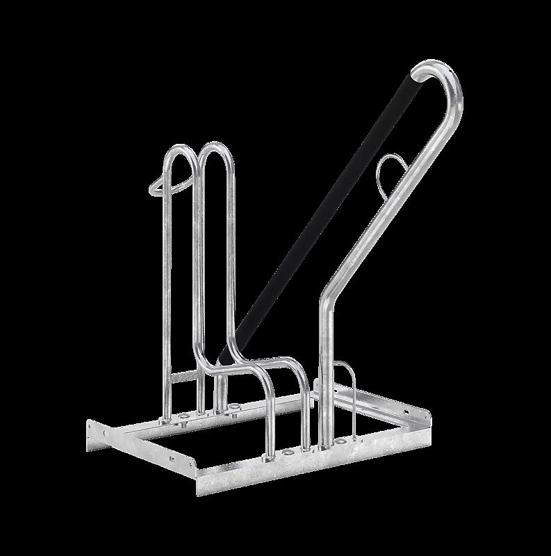 Stabile Stahlrohrkonstruktion mit angeschraubten Einstell- (Ø 18 mm) und Anlehnbügel (Ø 30 mm) mit Öse zum optimalen Diebstahlschutz durch handelsübliche Schlösser. Grundrahmen aus Winkelstahl, vorbereitet zur Reihenverbindung und Bodenbefestigung, jederzeit erweiterbar. Mit rahmenschonender Kunststoffummantelung in schwarz.