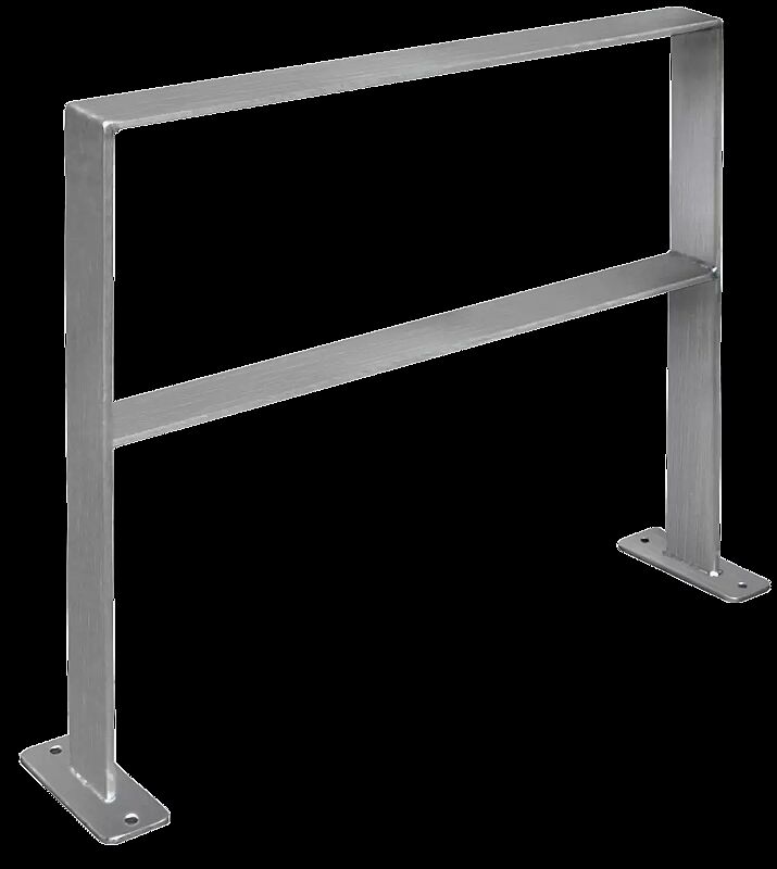 Anlehnbügel aus Edelstahl V2A, geschliffen Korn 240 (80 x 10 mm) mit Fußplatten (80 x 200 mm). Quersteg 560 mm über Flur. Befestigungsmaterial nicht im Lieferumfang enthalten, siehe Zubehör.
