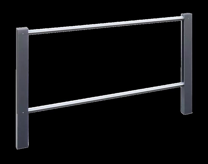 Geländersystem bestehend aus zwei quadratischen Pollern (80 x 80 mm) mit einer dekorativen länglichen Öffnung sowie zwei Verbindungsrohren (Ø 42 mm) aus Edelstahl V2A, geschliffen Korn 240. Das Geländersystem ist beliebig mit der Anbaueinheit (bestehend aus einem Poller und zwei Verbindungsrohren) erweiterbar. Geländerabschluss aus Edelstahl wahlweise in Halbbogen-Form oder als gerader Abschluss (Rohrendstück-Platte) Montage bauseits mit Kleber, siehe Zubehör.