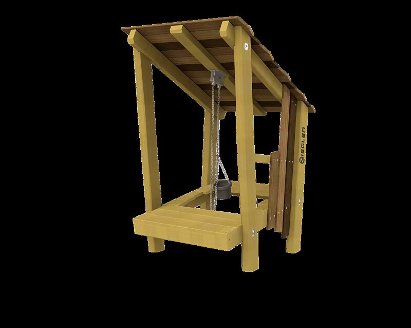 Spielhaus mit Pfosten (80 x 140 mm), einem schrägen Podest mit Aussparung, Dach sowie Seitenwänden aus FSC® 100 % - zertifiziertem Bilinga-Holz, geölt. Zusätzlich mit einem Eimer aus Gummi, welcher an einer langen Kette aus Edelstahl V4A am Dach befestigt und mittels einem Sandaufzug nutzbar ist. Alle weiteren Stahlteile aus Edelstahl V2A. Mit eingefrästem, farblich hervorgehobenem ZIEGLER-Schriftzug. Alle Kanten abgerundet. Die Lieferung erfolgt montiert auf Palette inkl. Montageanleitung (Entladen bauseits). Gerät entspricht EN 1176. Der angegebene Platzbedarf ist inkl. Sicherheitsbereich.