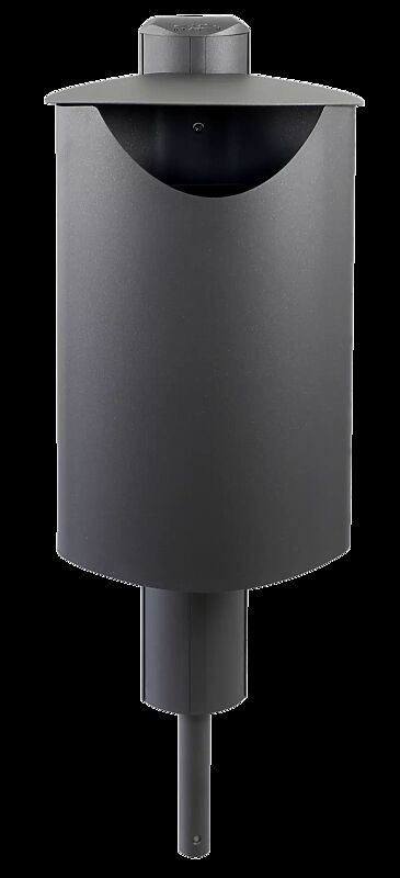 Abfallbehälter aus Stahlblech. Pfosten aus Aluminium, pulverbeschichtet. Mit Abfallsackhaltergung. Ohne Verriegelung. Deckel nach oben klappen und Abfallsack (exkl.) zum Entleeren entnehmen.