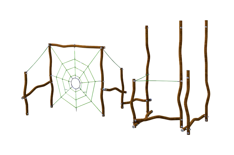 Klettergerüst bestehend aus leicht geschwungenen Rundpfosten unterschiedlicher Höhe und Balken (Ø 89 mm) aus wiederverwendbarem Edelstahl V2A, pulverbeschichtet und zusätzlich mit witterungsbeständigem Transferdruck in Holzoptik. Inkl. farbigen Halteseilen (Ø 16 mm) und großem Kletternetz aus Polyester, standardmäßig in grün. Auf Anfrage sind weitere Farben gegen Mehrpreis möglich. Alle Seile sind mit einer stabilen Aufhängung an den Standpfosten befestigt. Gerät TÜV-geprüft nach Euronorm EN 1176. Die Anlieferung erfolgt zerlegt auf Palette inkl. Montageanleitung (Entladen bauseits). Der angegebene Platz ist inkl. Sicherheitsbedarf.