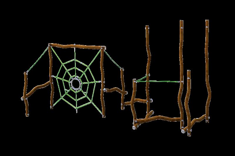 Klettergerüst bestehend aus leicht geschwungenen Rundpfosten unterschiedlicher Höhe und Balken (Ø 89 mm) aus wiederverwendbarem Edelstahl V2A, pulverbeschichtet und zusätzlich mit witterungsbeständigem Transferdruck in Holzoptik. Inkl. farbigen Halteseilen (Ø 16 mm) und großem Kletternetz aus Polyester, standardmäßig in grün. Auf Anfrage sind weitere Farben gegen Mehrpreis möglich. Alle Seile sind mit einer stabilen Aufhängung an den Standpfosten befestigt. Gerät TÜV-geprüft nach Euronorm EN 1176. Die Anlieferung erfolgt zerlegt auf Palette inkl. Montageanleitung (Entladen bauseits). Der angegebene Platz ist inkl. Sicherheitsbedarf. Empfohlene Fundamentgrößen: 10 x Ø 500 x T 500 mm