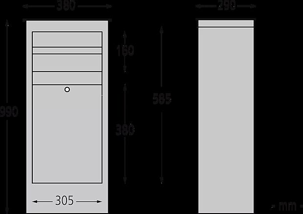 Freistehendes Briefkastensystem aus Stahlblech, sendzimirverzinkt und pulverbeschichtet. Bestehend aus 1 Zustellbox für Briefe und Pakete. Paketeinwurfklappe mit integrierter Briefeinwurfklappe. Einwurf und Entnahme vorn. Verriegelung der Entnahmetür mittels Zylinderschloss, Lieferung inkl. 2 Schlüsseln.