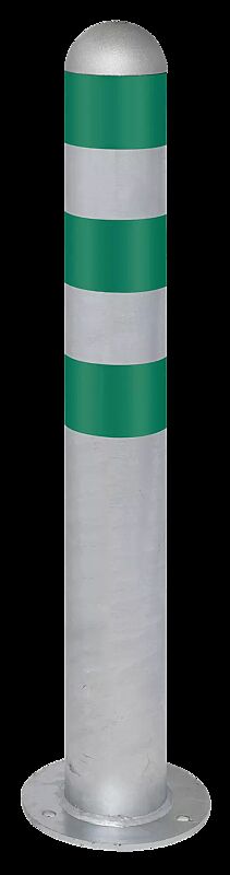 Schutzpoller zum Sichern von E-Ladestationen aus Stahl (Ø 108 mm), Wandstärke 2 mm. Pollerkopf aus Aluminium. Mit 3 Reflexstreifen (je 75 mm hoch) in grün. Zum Aufdübeln mit Bodenplatte (Ø 200 mm), Befestigungsmaterial nicht im Lieferumfang enthalten.