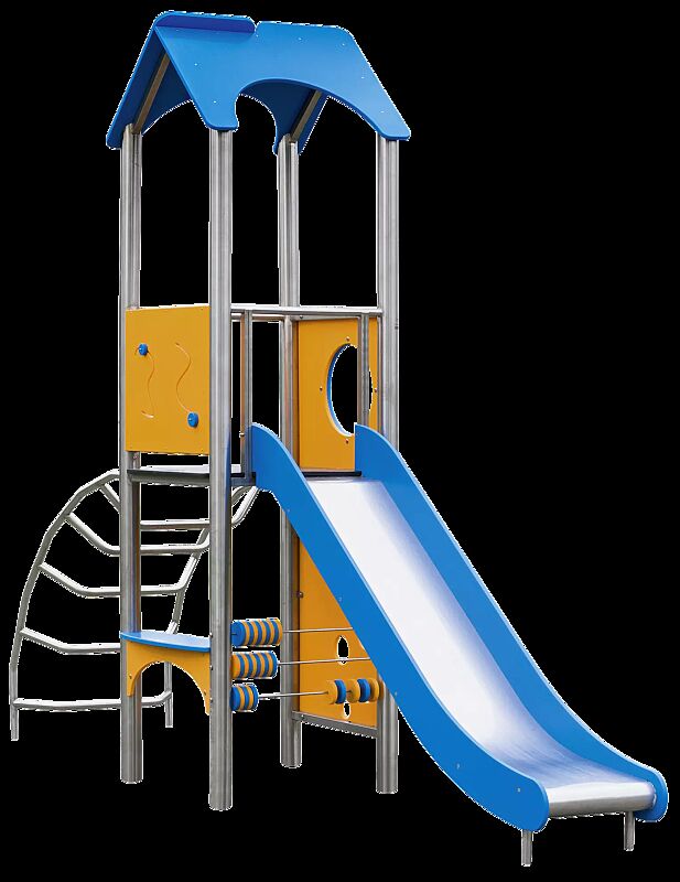 Spielgerät bestehend aus Pfosten und Balken aus Edelstahl. Turm mit Podest (Höhe 1300 mm) sowie Dach aus farbigen HDPE-Kunststoffpaneelen, Bogenleiter (Länge 1200 mm) und gerade Rutsche (Länge 1800 mm) aus Edelstahl mit HDPE-Seitenwänden in Standardfarben. Inkl. Kletterwand mit Grifflöchern, Spieltafel, Verkaufstheke und Spielabakus aus HDPE-Kunststoffpaneelen. Gerät geprüft nach Euronorm EN 1176. Die Anlieferung erfolgt teilmontiert auf Palette inkl. Montageanleitung (Entladen bauseits). Für die Entladung vor Ort wird ein Stapler benötigt. Der angegebene Platzbedarf ist inkl. Sicherheitsbereich.