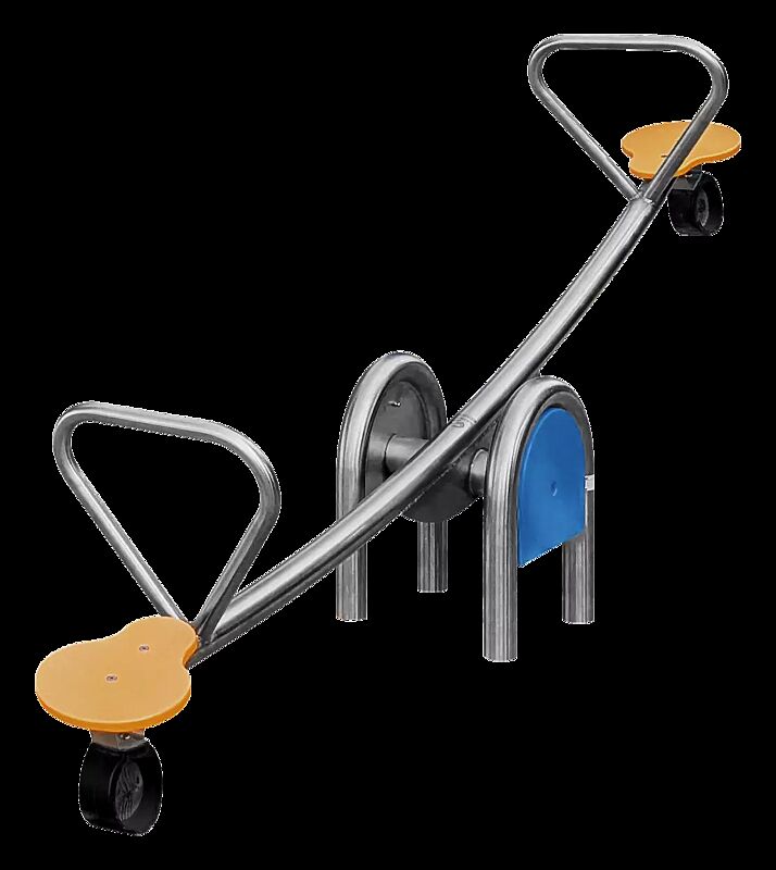 Wippe bestehend aus einem Wippbalken (Ø 88,9 mm) und zwei geformten Haltegriffen aus Edelstahl V2A (mit mattem Finish). Sitzflächen standardmäßig in orange und Seitenpaneelen in blau aus HDPE-Kunststoffpaneelen (Materialstärke 19 mm). Auf Anfrage auch in den Farben hellgrün, dunkelgrün, gelb, rot und schwarz erhältlich. Inkl. Gummi-Dämpfer als Aufschlagsdämpfungselement. Gerät geprüft nach Euronorm EN 1176.