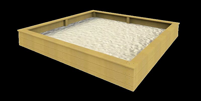 Sandkasten mit Unterkonstruktion und Sitzflächen aus FSC® 100%-zertifiziertem Bilinga-Holz. Alle Kanten abgerundet. Die Lieferung erfolgt teilmontiert auf Palette inkl. Montageanleitung. Der angegebene Platzbedarf ist inkl. Sicherheitsbereich.