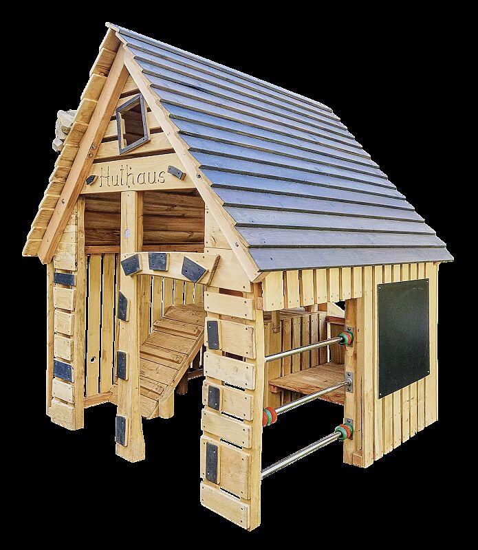 Spielhaus mit Pfosten, Balken, Satteldach und Seitenwandbelattung aus FSC®-zertifiziertem Robinienholz, geschält und geschliffen. Mit einem Podest (Höhe 590 mm) mit Auf- und Abstiegsmöglichkeit sowie einem zusätzlich kleineren Podest (Höhe 250 mm) im Innenraum. Inkl. Gucklöcher, Fenster, Schriftzug "Huthaus" an den Giebeln, einer Rutschrampe aus HPL sowie einer Maltafel und Abakus an der Außenwand. Podestflächen mit Riffeldiele aus Eiche. Dach, Fensterrahmen und Dekoelemente farbig UV-lasiert. Auf Anfrage können kundenspezifische Änderungen (Schriftzug und Gestaltungselemente) vorgenommen werden. Alle Verbindungselemente aus Edelstahl V2A. Gerät gefertigt nach Euronorm EN 1176. Der angegebene Platzbedarf ist inkl. Sicherheitsbereich. Die Lieferung erfolgt vormontiert (Entladen bauseits). Empfohlene Fundamentgrößen: 13 x L 400 x B 400 x T 800 mm